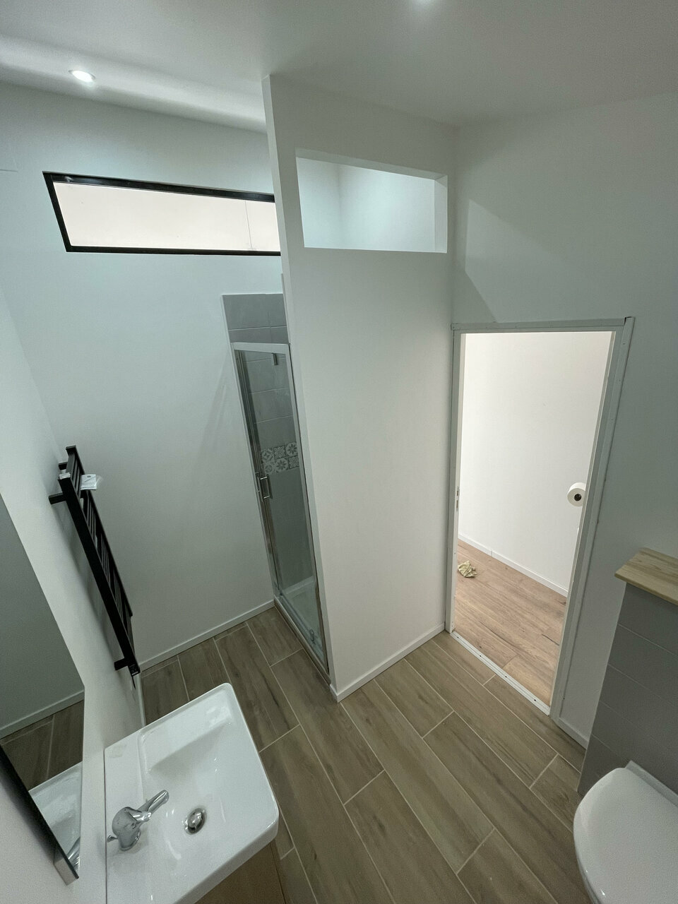 Il comporte un coin cuisine avec un espace pause, une salle d’eau avec douche, de nombreux placards de rangements, de grandes baies vitrées donnant accès à une terrasse, ainsi que 10 places de parking.